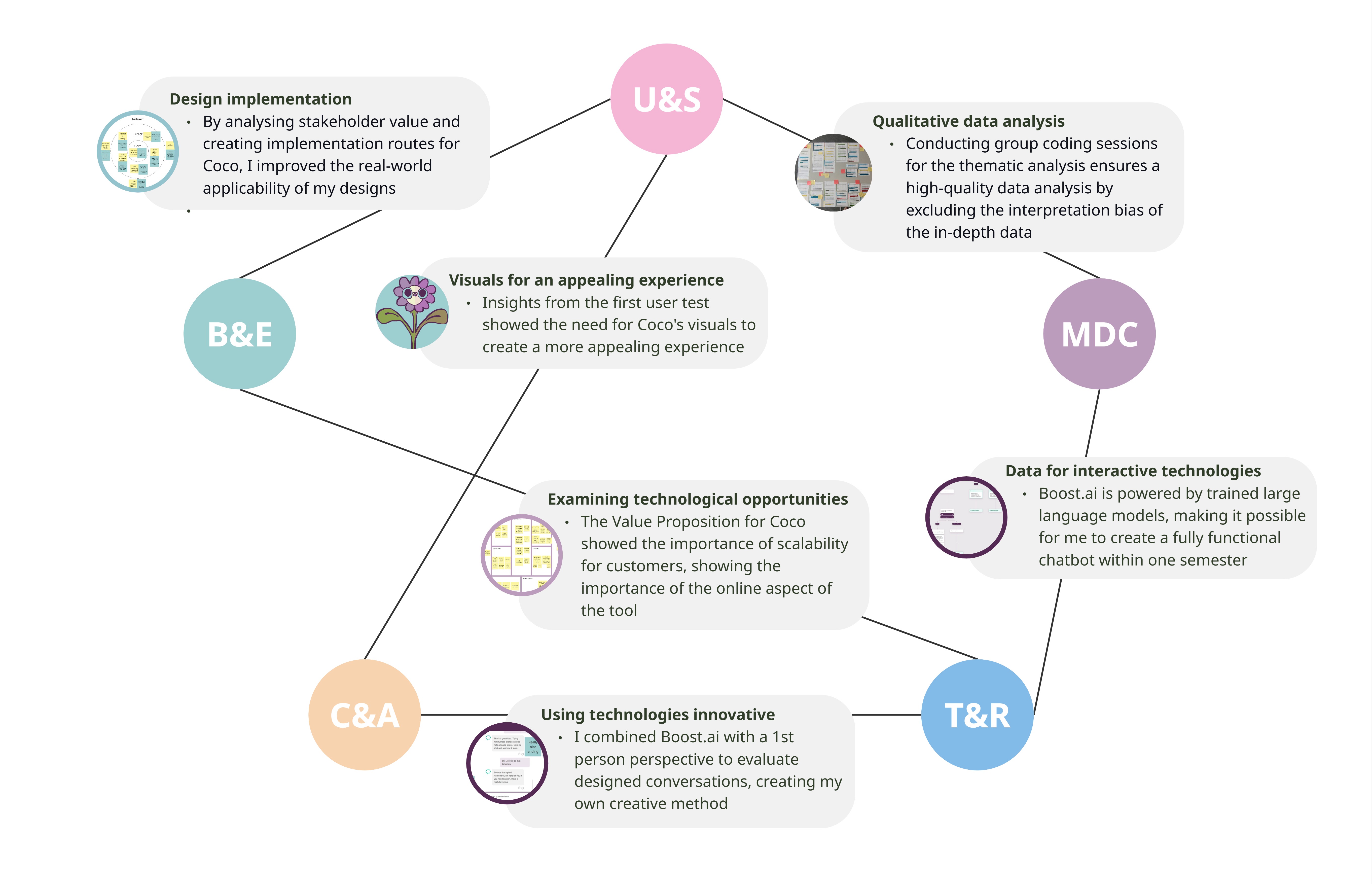 U&S MD&C C&AIn my FMP, I integrated user insights into my USD process for both direction and validation. I gathered these insights in sessions with emerging adults, where participants tried a prototype followed by a semi-structured interview on the experience. This combined my U&C and MD&C, as I analysed data thematically to identify patterns across participants from sessions focused on gathering design input from lived experiences. A clear example of applying user insights was in creating the visuals for Coco, where the C&A process was directly grounded in user feedback.