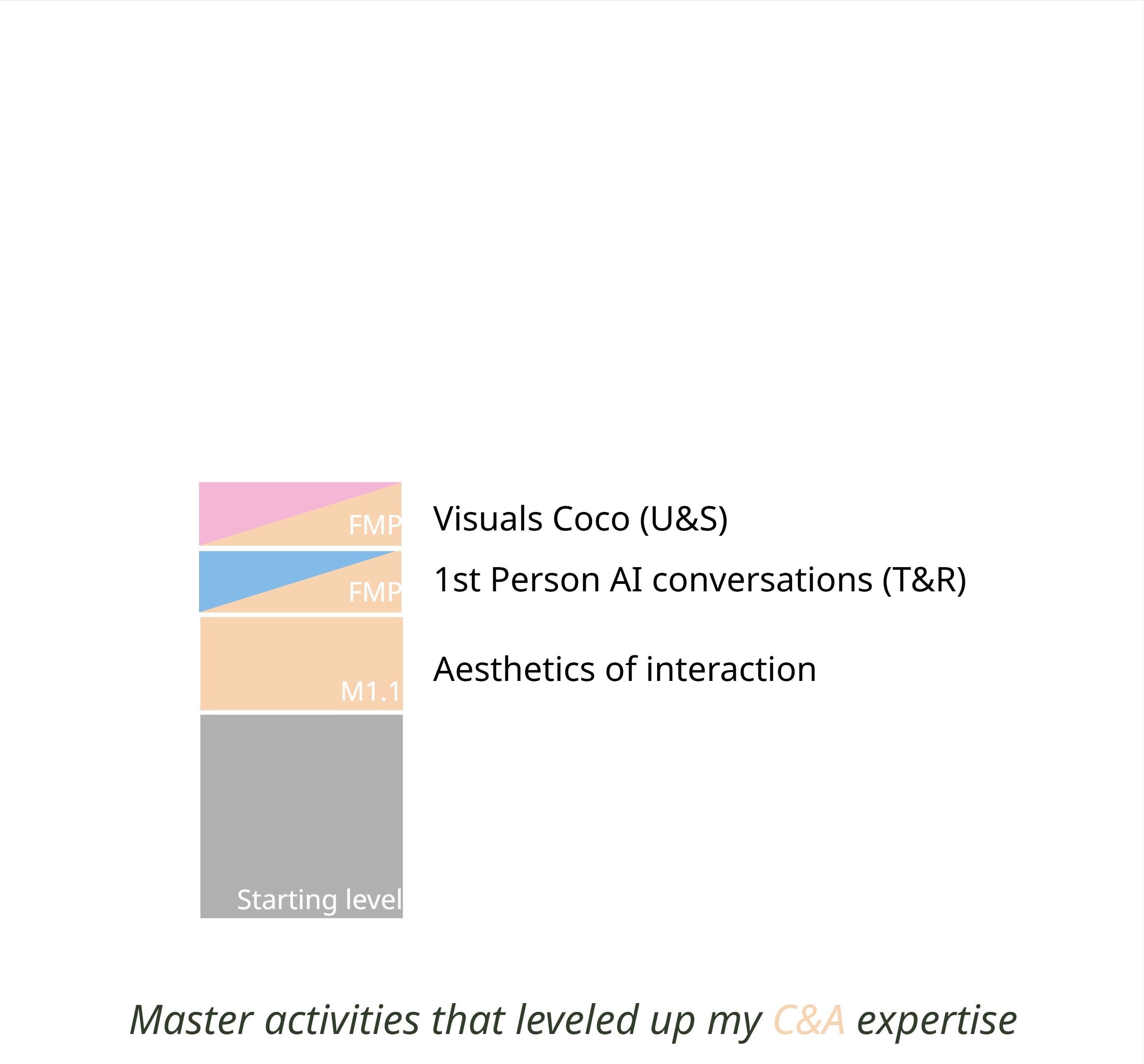 Throughout my studies, I have built a repertoire of creative techniques. But for me, creativity is not only about applying existing techniques but also about having the attitude to create new ones. I apply my own creative techniques throughout my projects, for example, combining C&A with T&R by using 1st person perspective in combination with AI as a tool for ideation and fine-tuning in my FMP. While I am not particularly strong in the graphics side of aesthetics, I am interested in aesthetics of interaction as it helps guide user behaviour. Through my M1.1 I also used material-driven aesthetics of interaction as an idea generation technique.