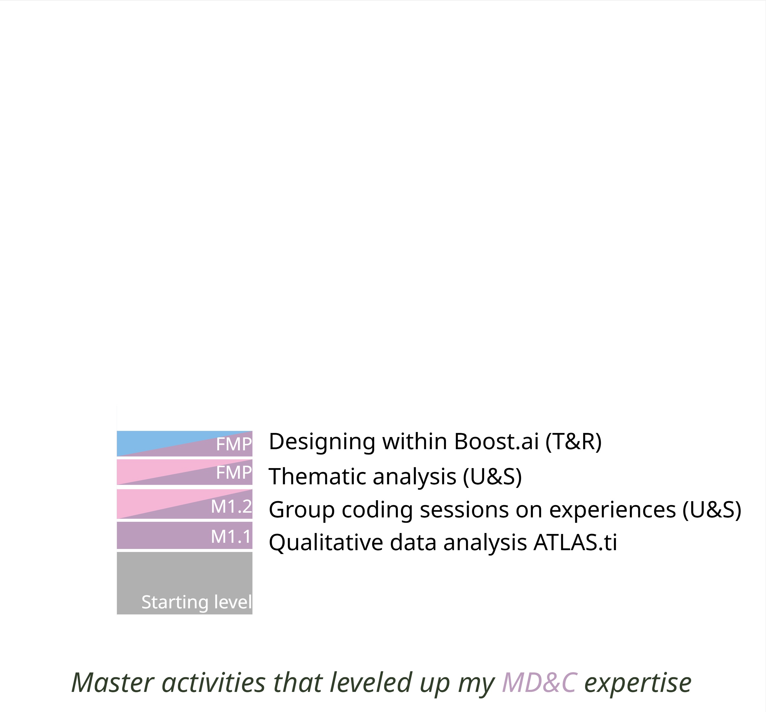 My skills within MD&C are overall limited, but one aspect I find especially valuable for my vision and design process is working with qualitative data. This directly supports one of my strongest U&S skills: conducting in-depth user evaluations. Through my master’s projects, I gained extensive experience in analysing interview and user test data. In M1.1, I worked with ATLAS.ti, after which I chose to focus more on lived experiences and searched for methods that aligned better with my vision. During M1.2 and my FMP, I developed the ability to conduct group coding sessions and perform thematic analyses, allowing me to ground my designs in rich user insights.
